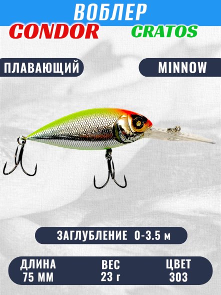 ➤ Какие отзывы на товар "Воблер CONDOR CRATOS размер 75 мм вес 23,0 гр заглубление 0 - 3,5 м цвет 303"?
